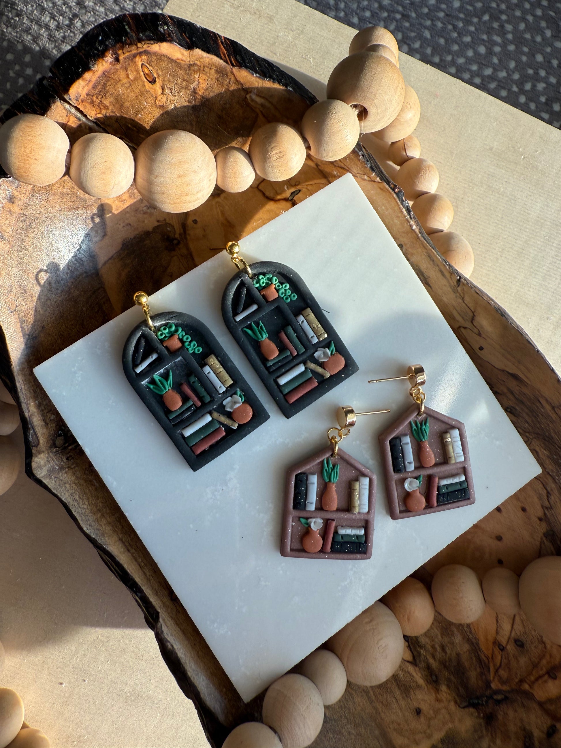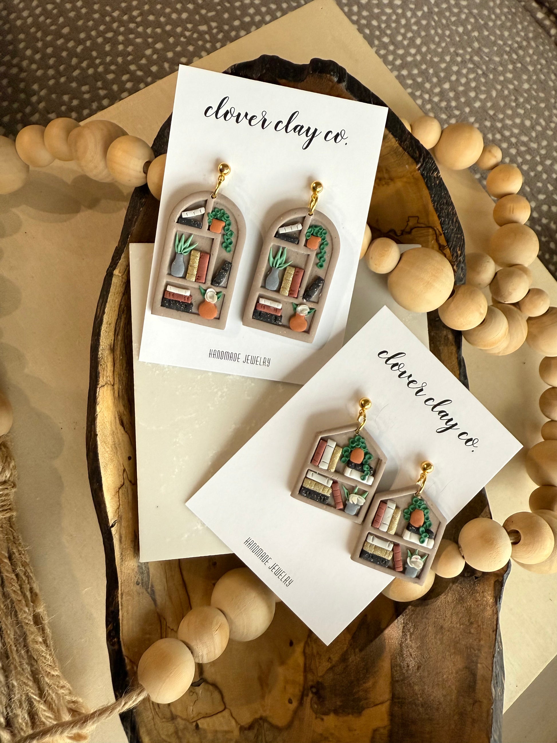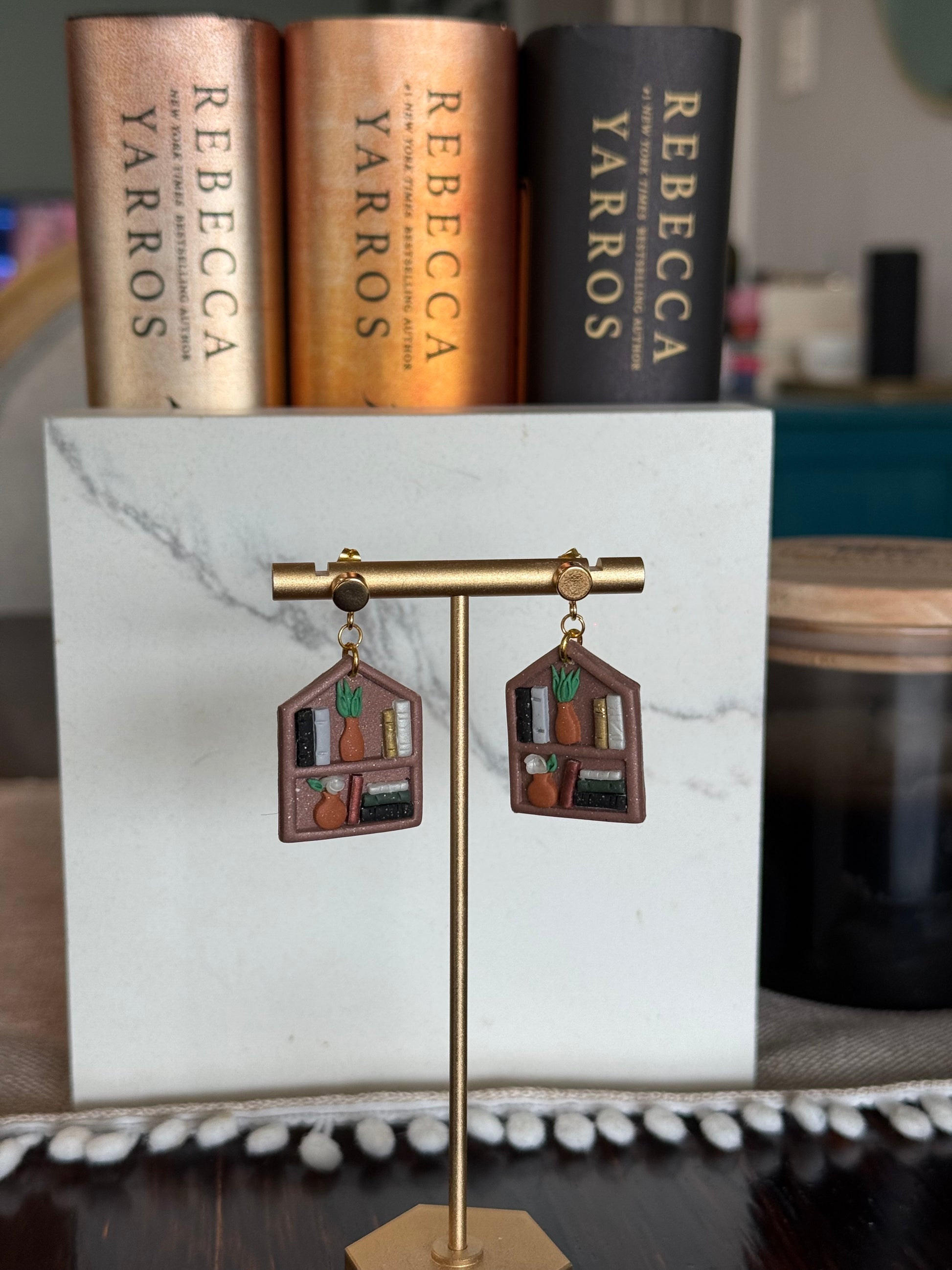 Detailed tiny bookcases with itty bitty plants! Gold plated hook posts.