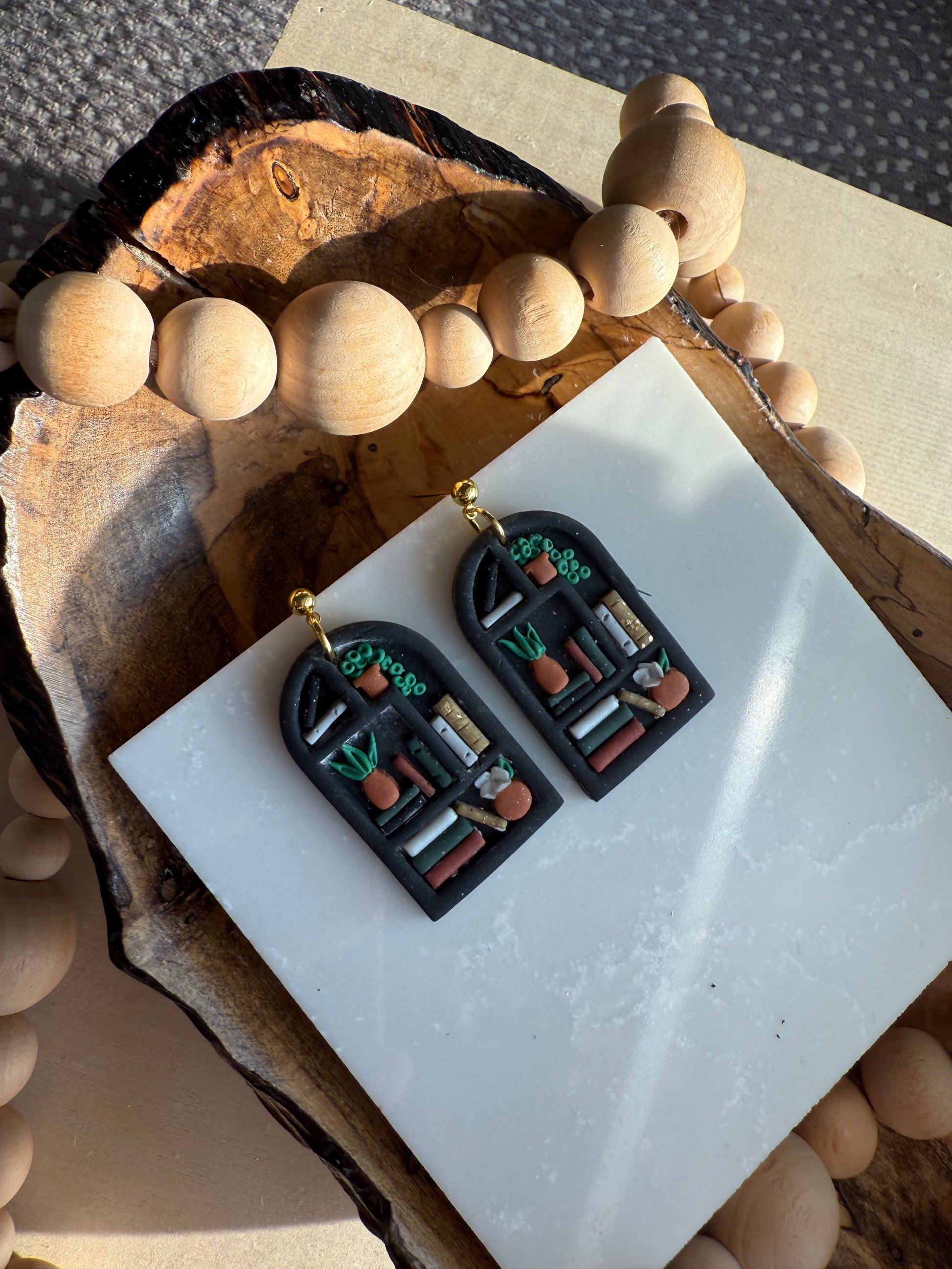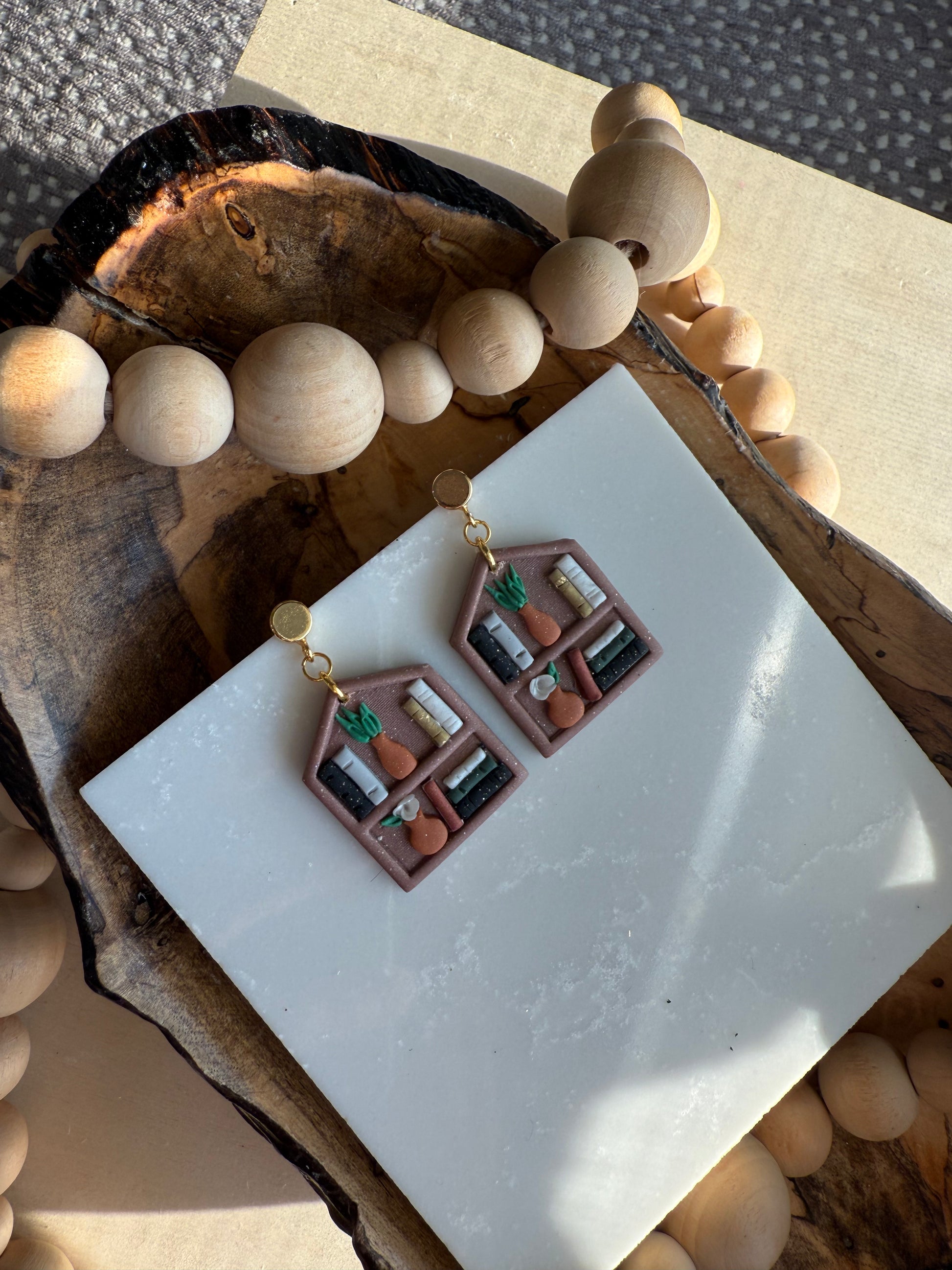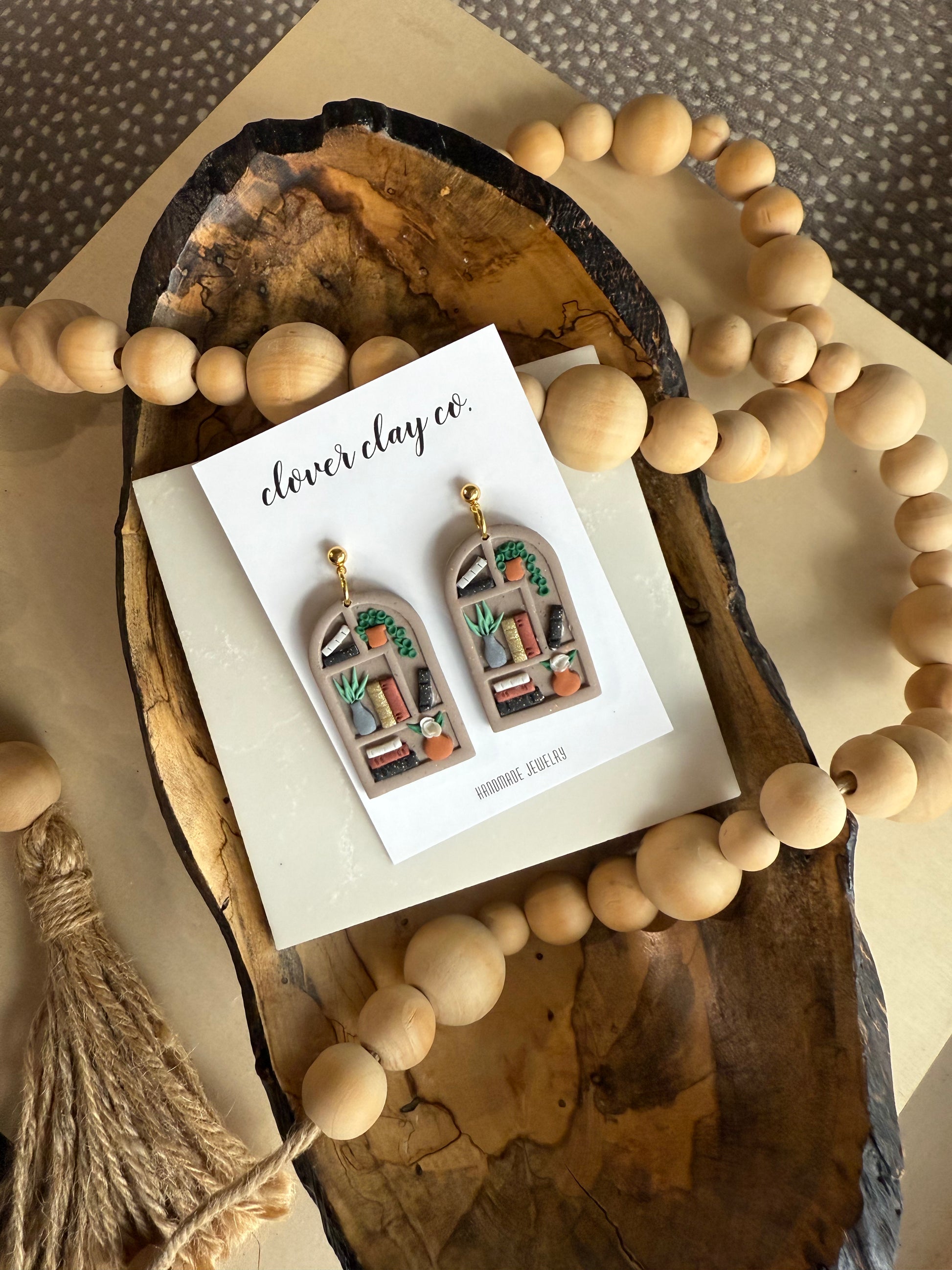 Detailed tiny bookcases with itty bitty plants! Gold plated hook posts.
