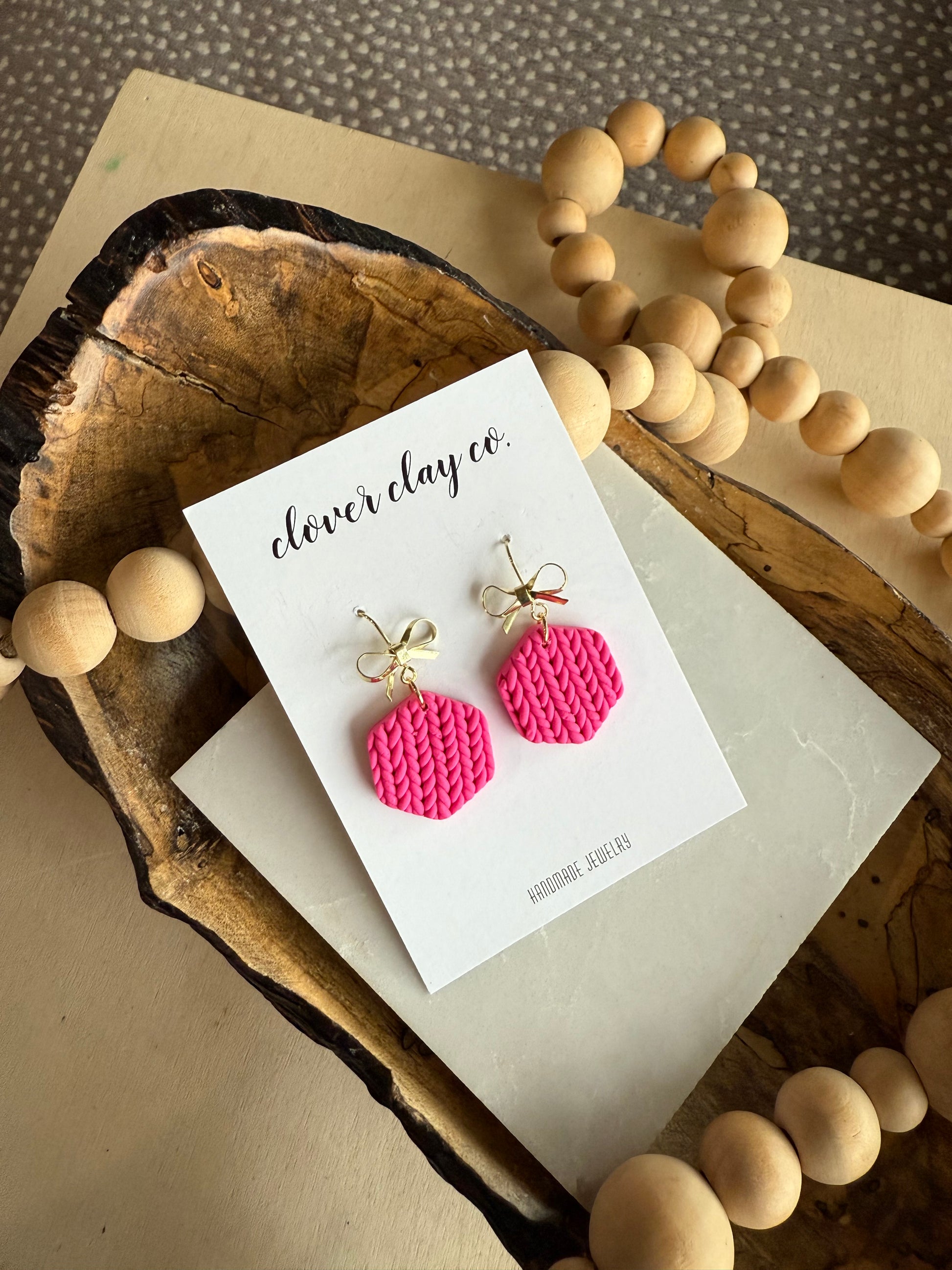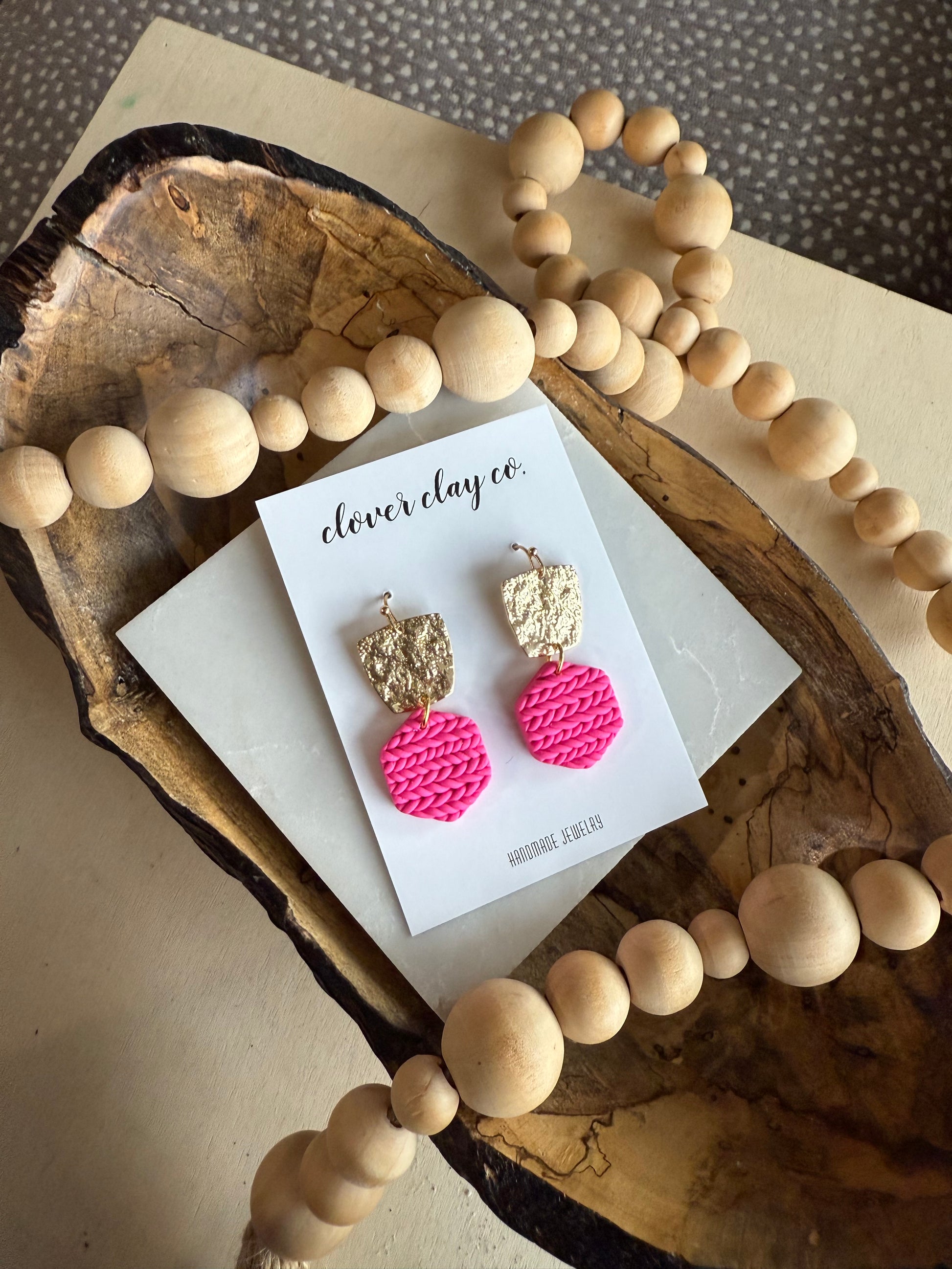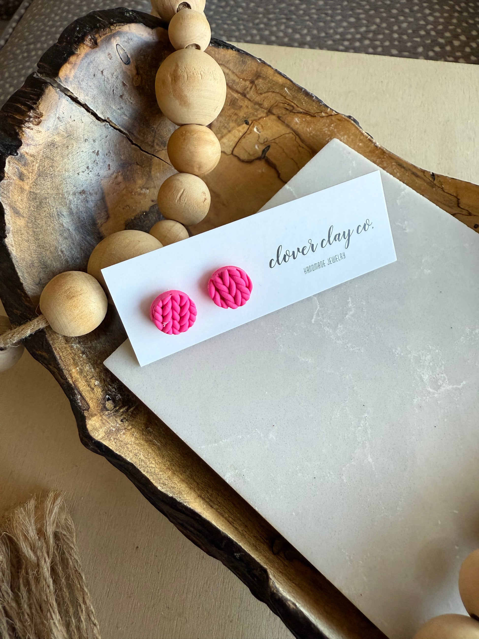 Hand laid clay into a cable knit pattern. Gold plated studs.