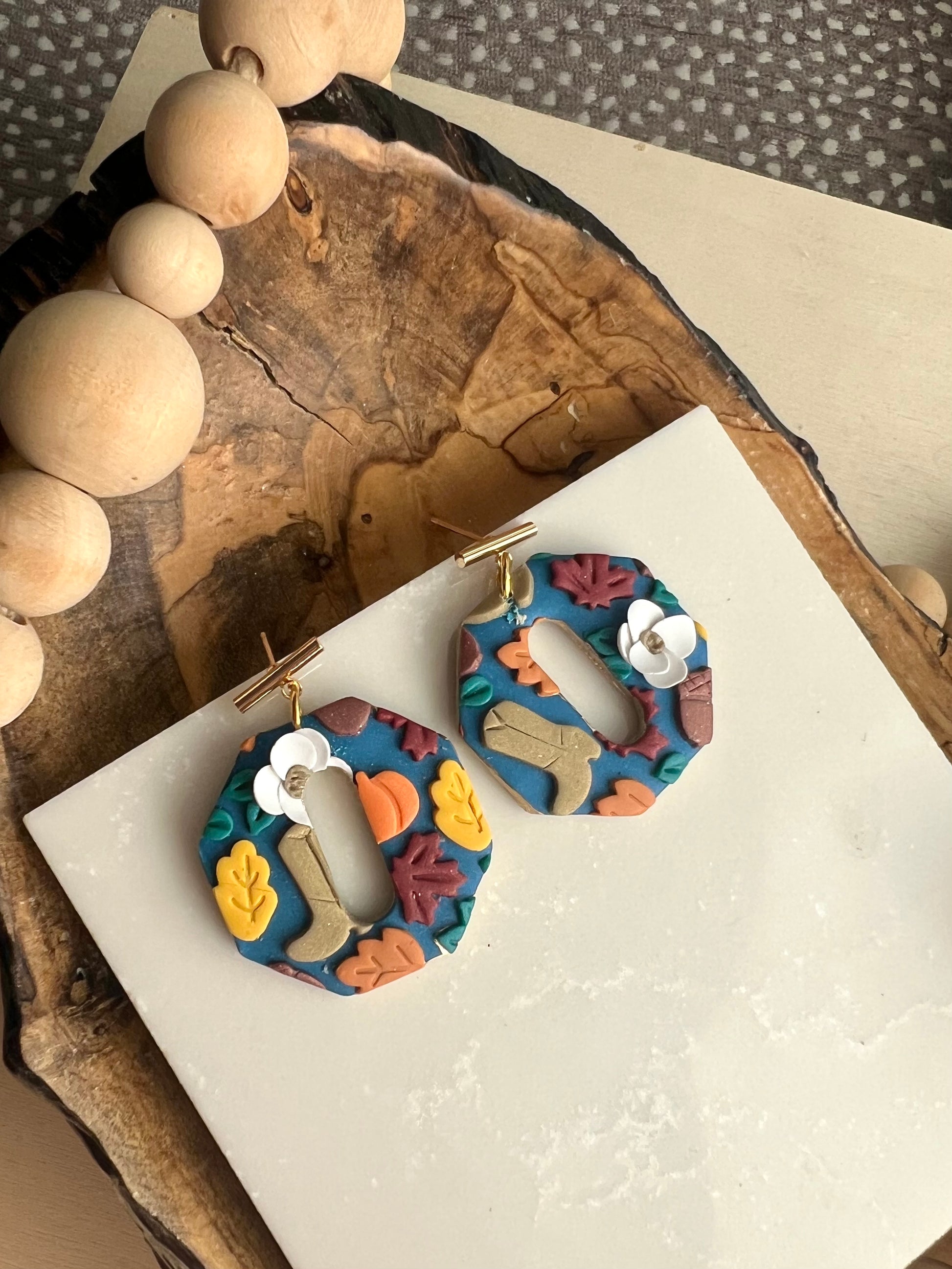 Navy clay base with tiny fall clay accents. Gold plated post.
