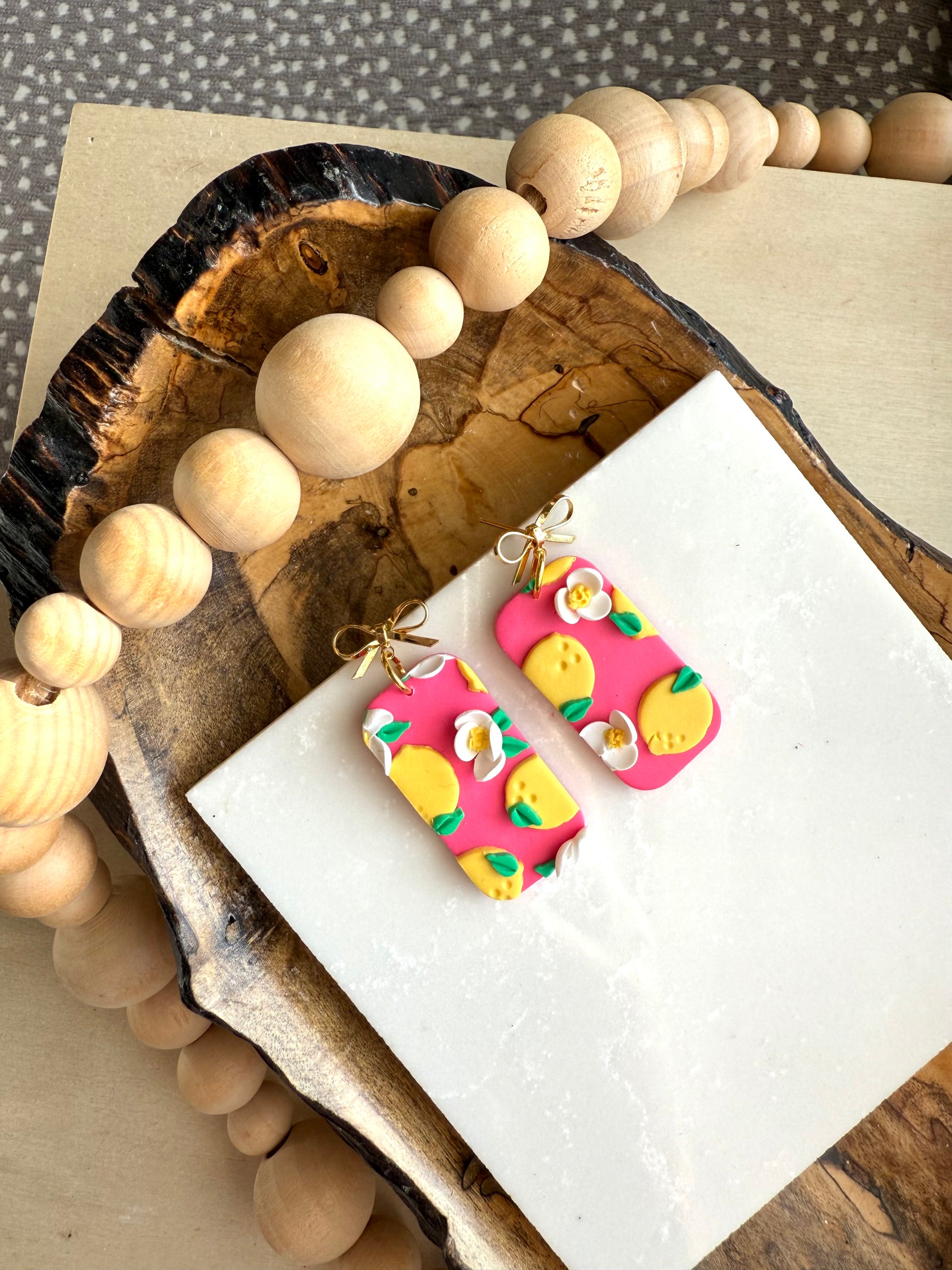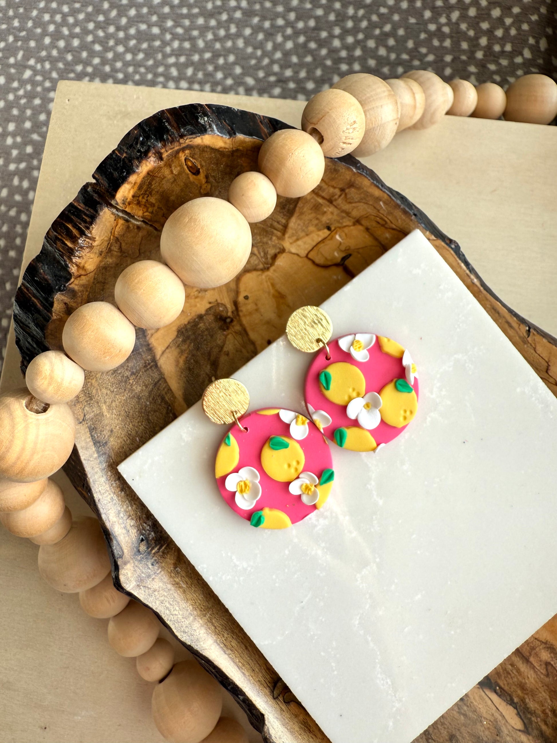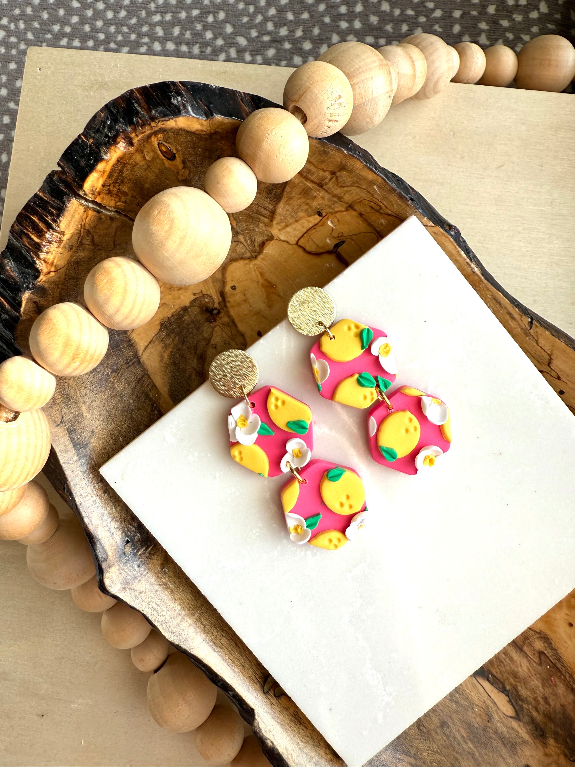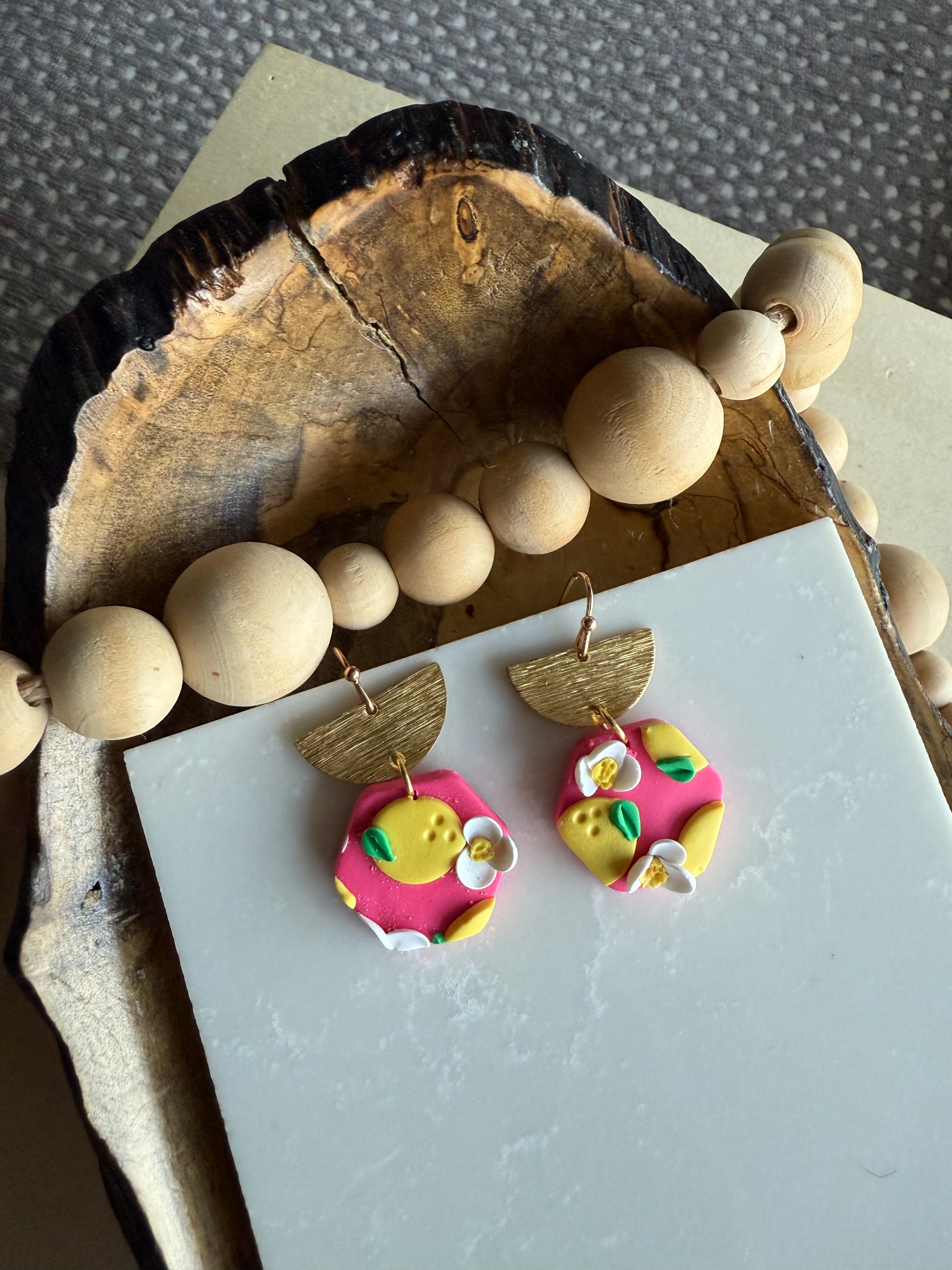 Pink background clay with detailed lemons and white floral accents. Gold plated studs.