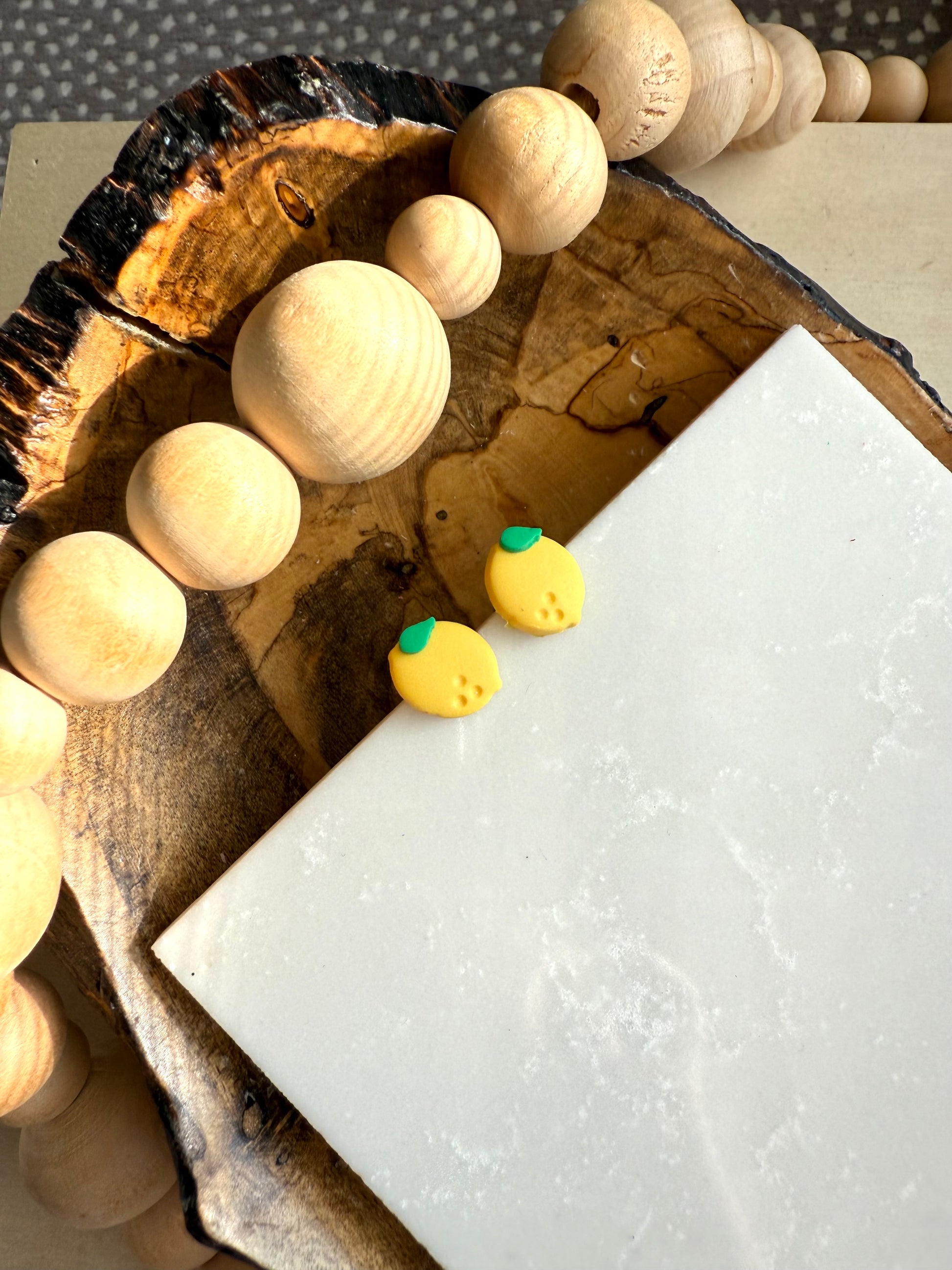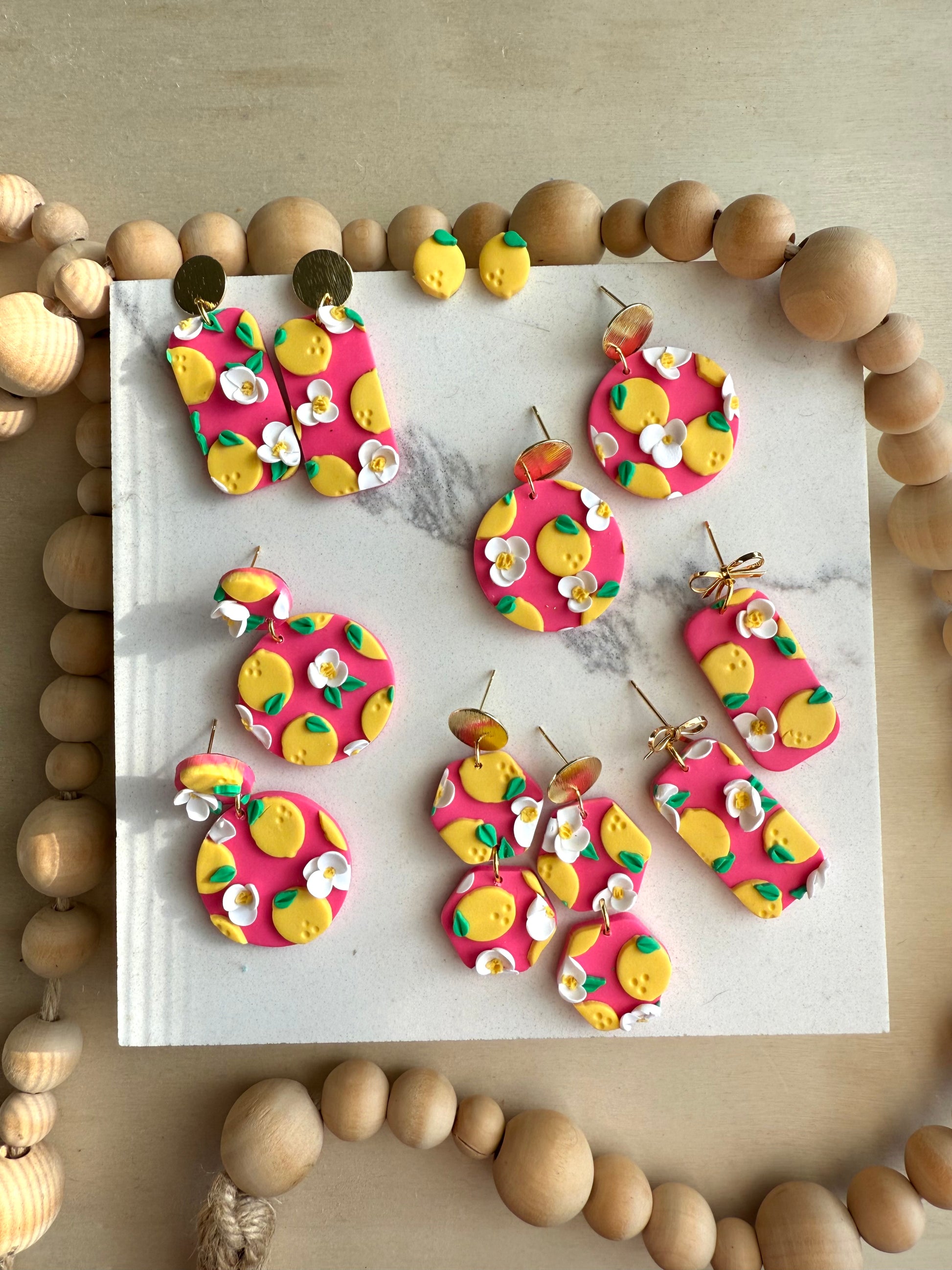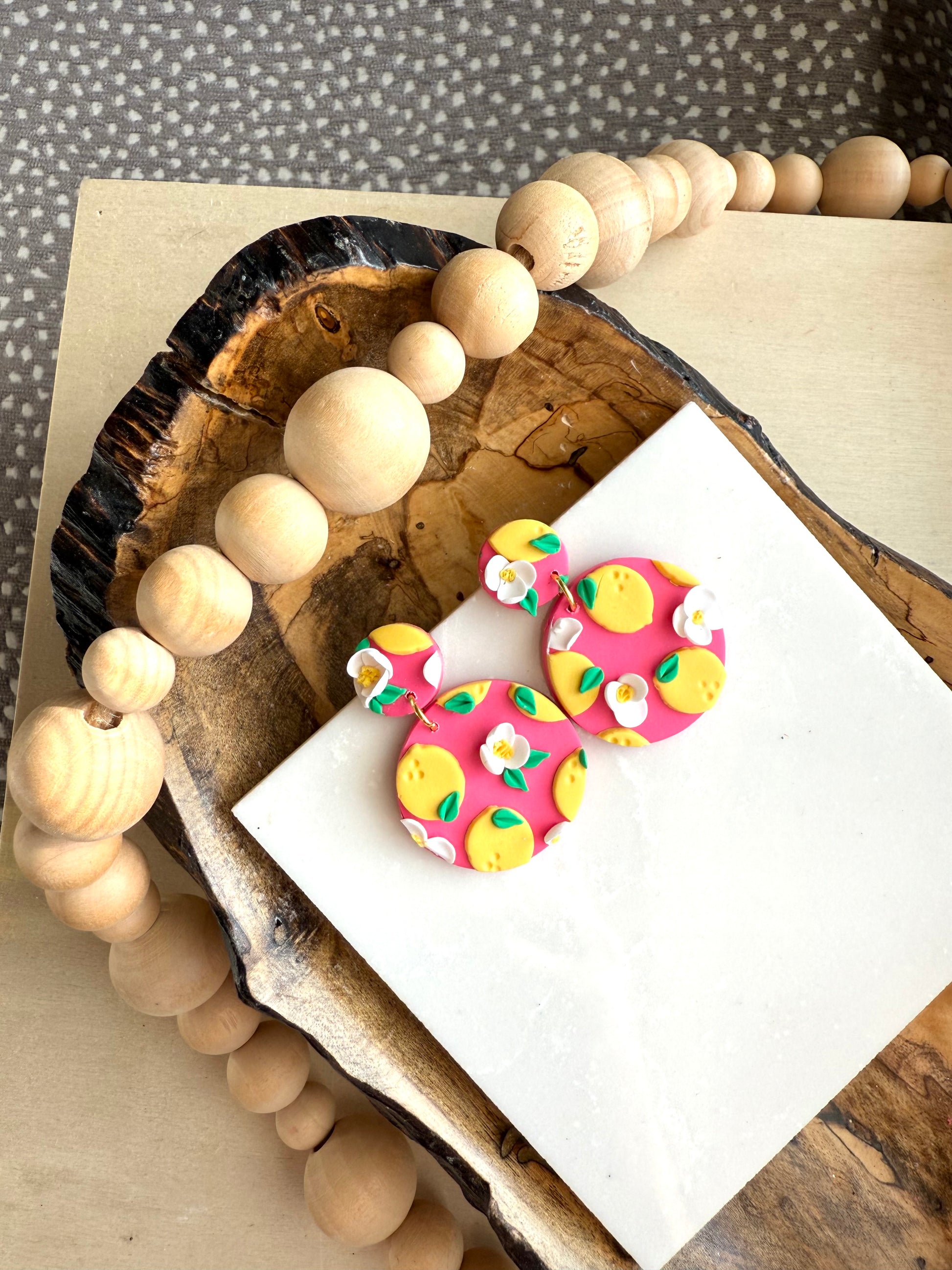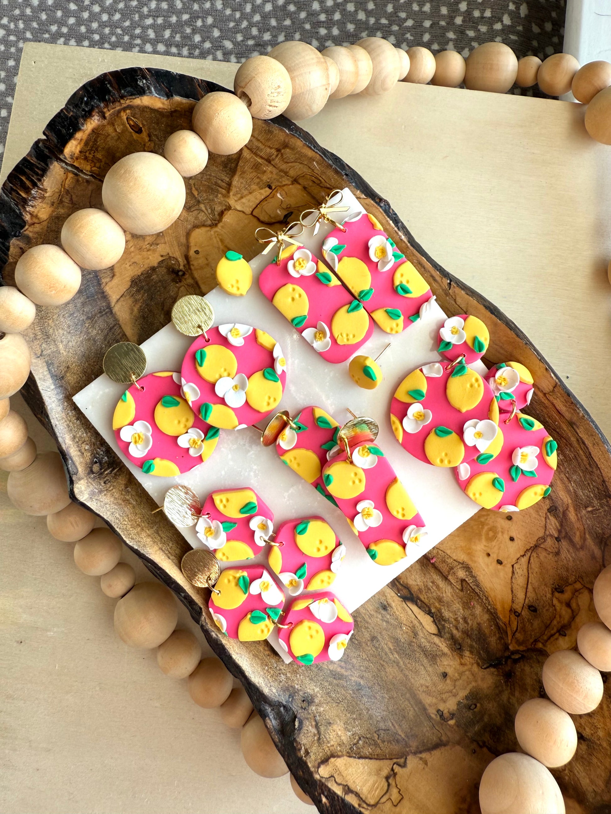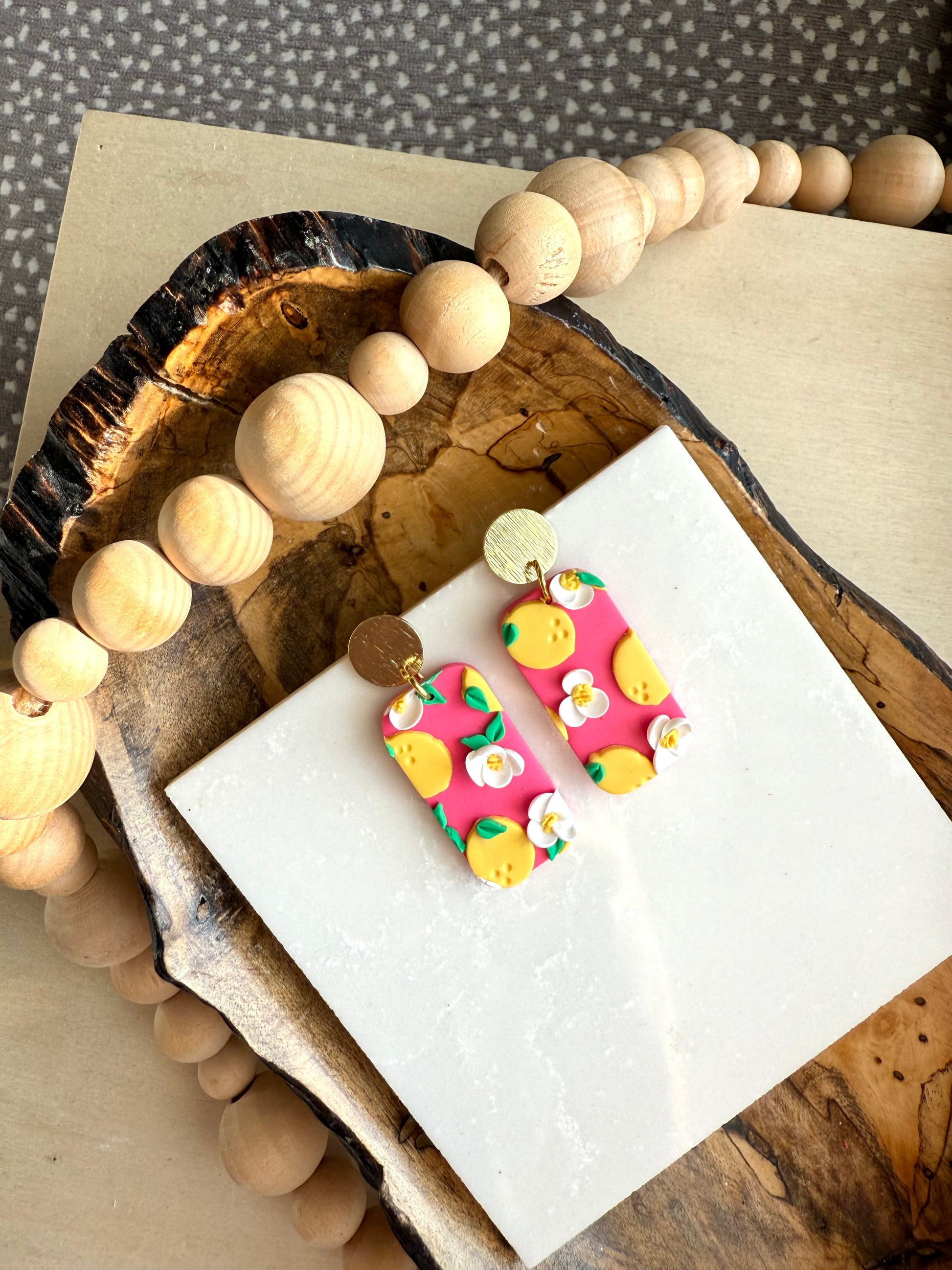 Pink background clay with detailed lemons and white floral accents. Gold plated studs.