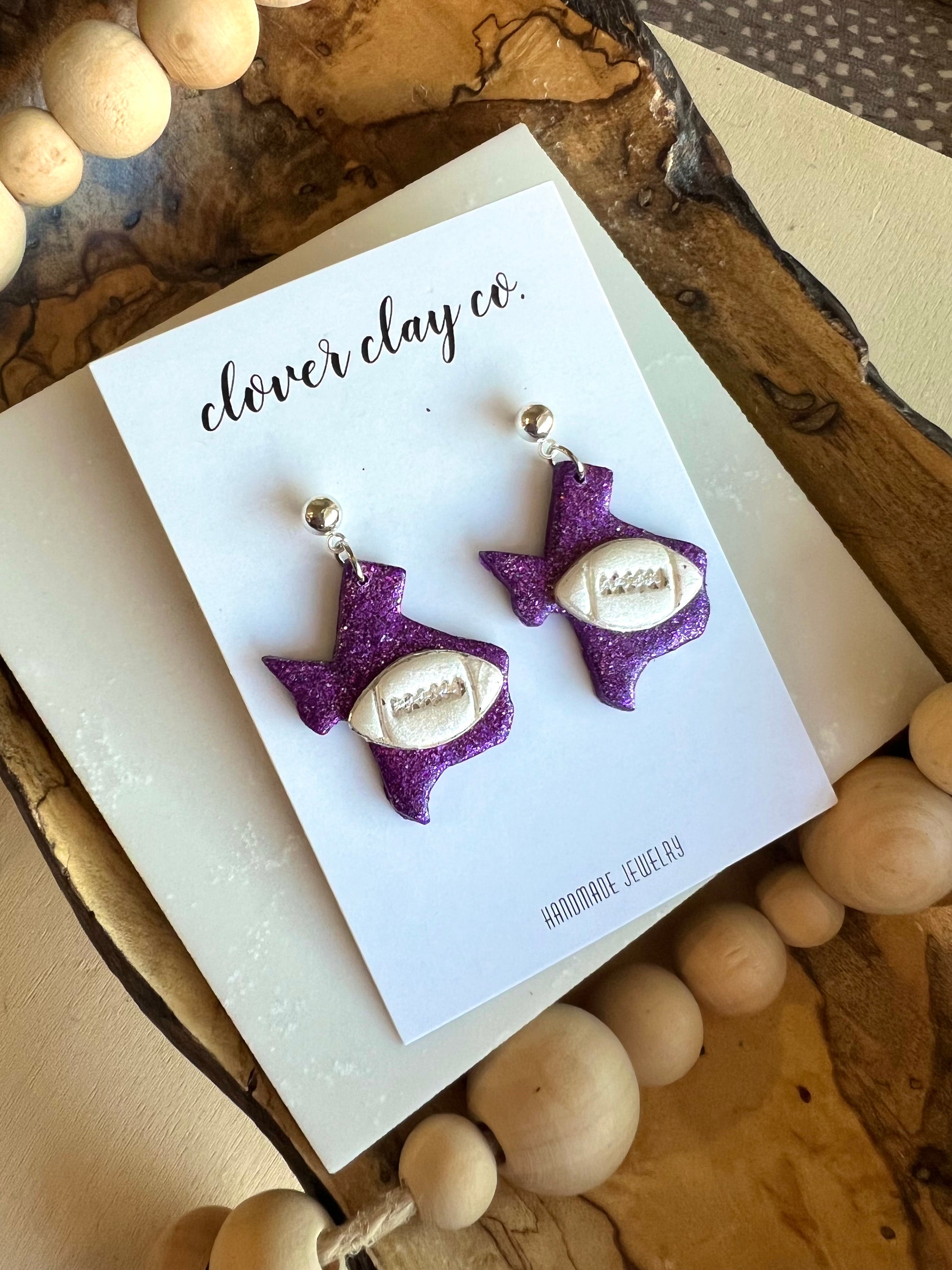 Glitter purple with a pearly TCU or football accent. Silver plated studs.