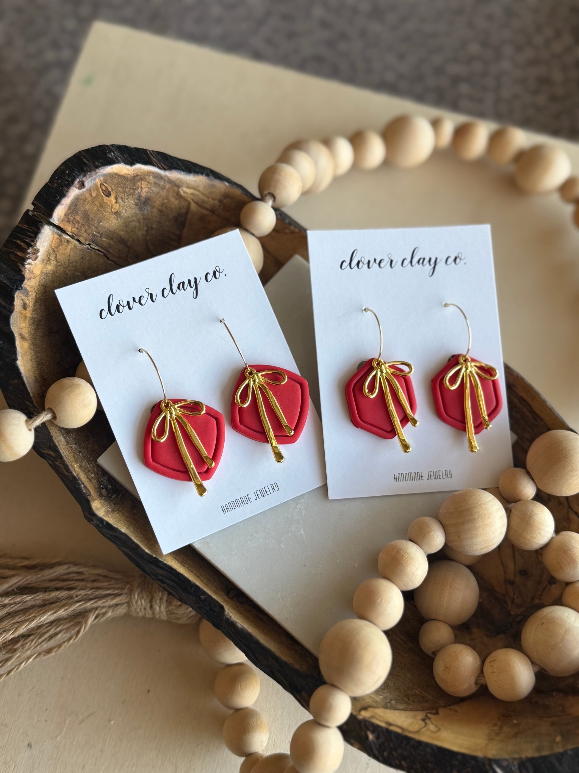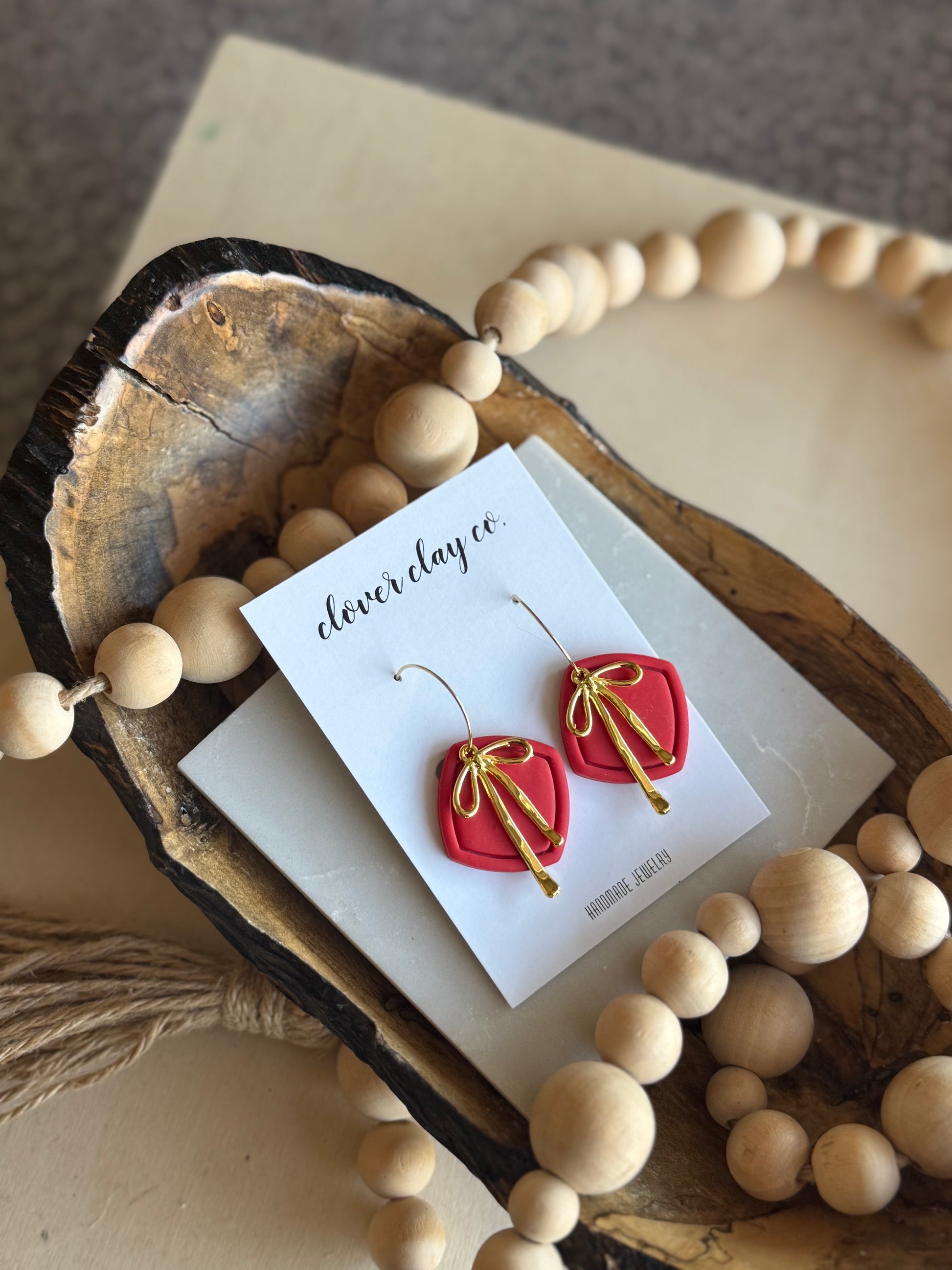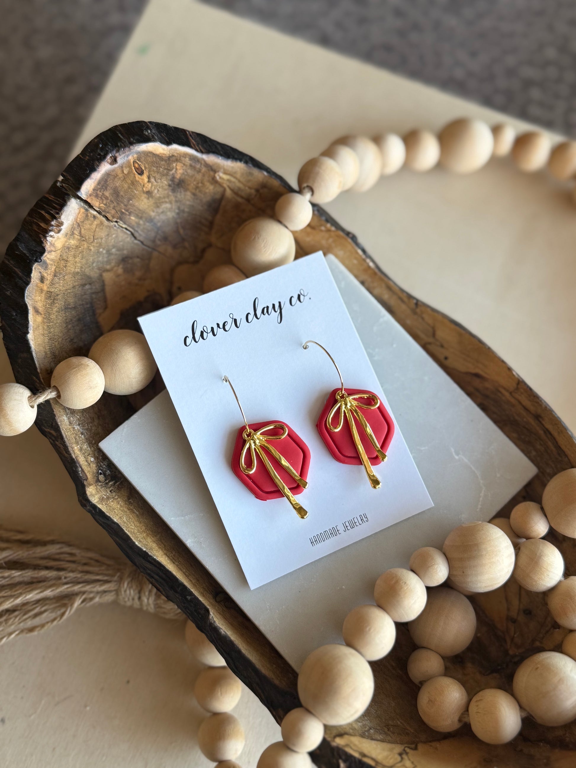 Perfect clay framed pieces with a bow accent. Gold plated hoop.