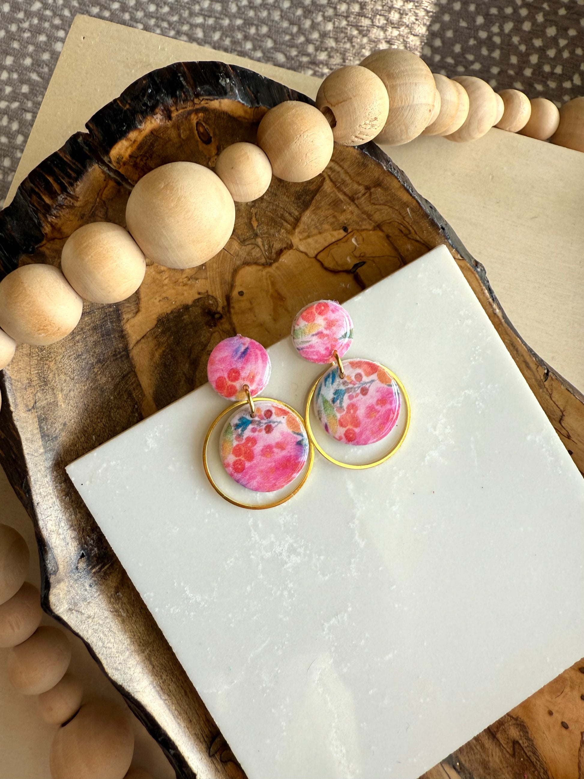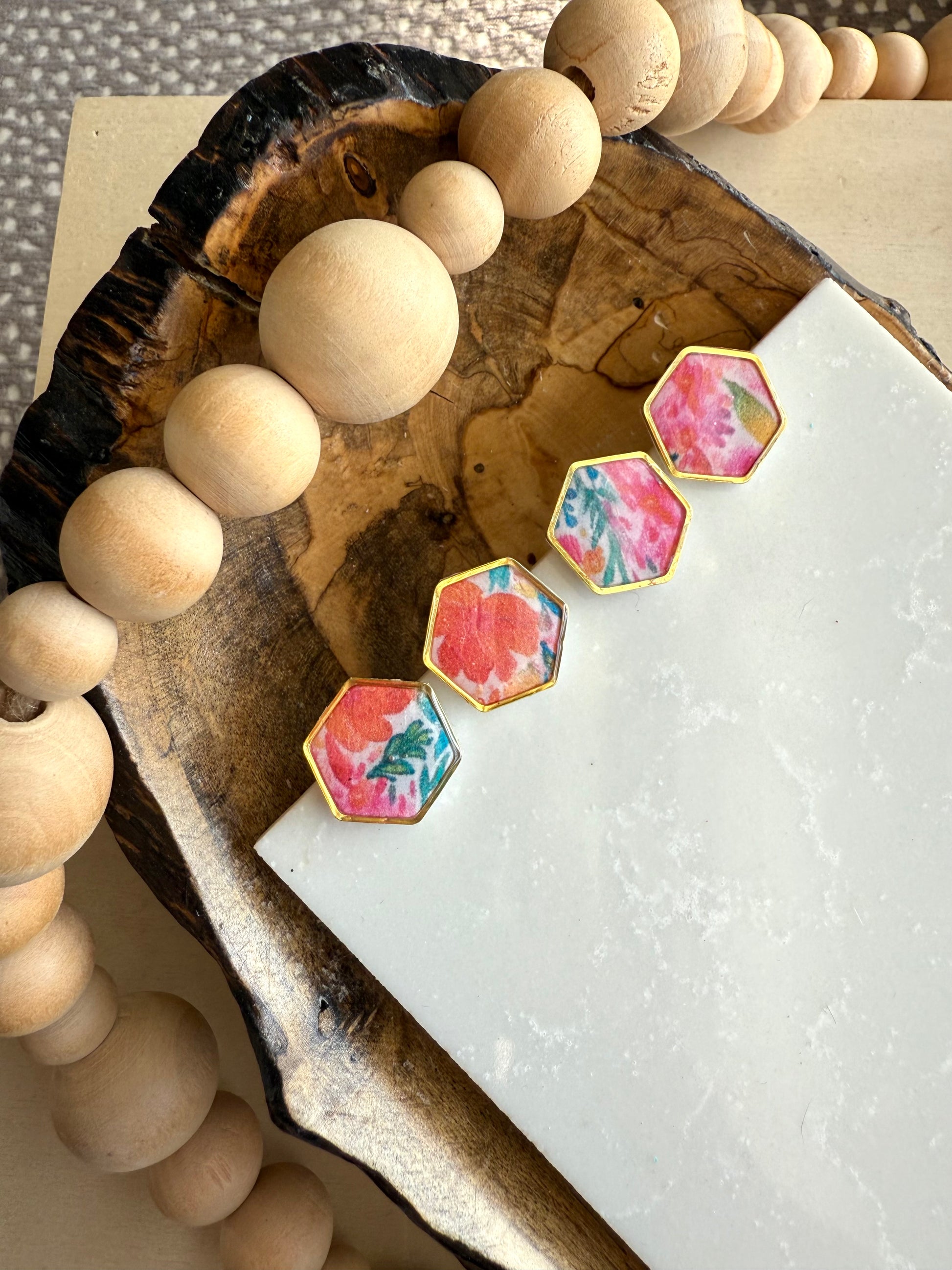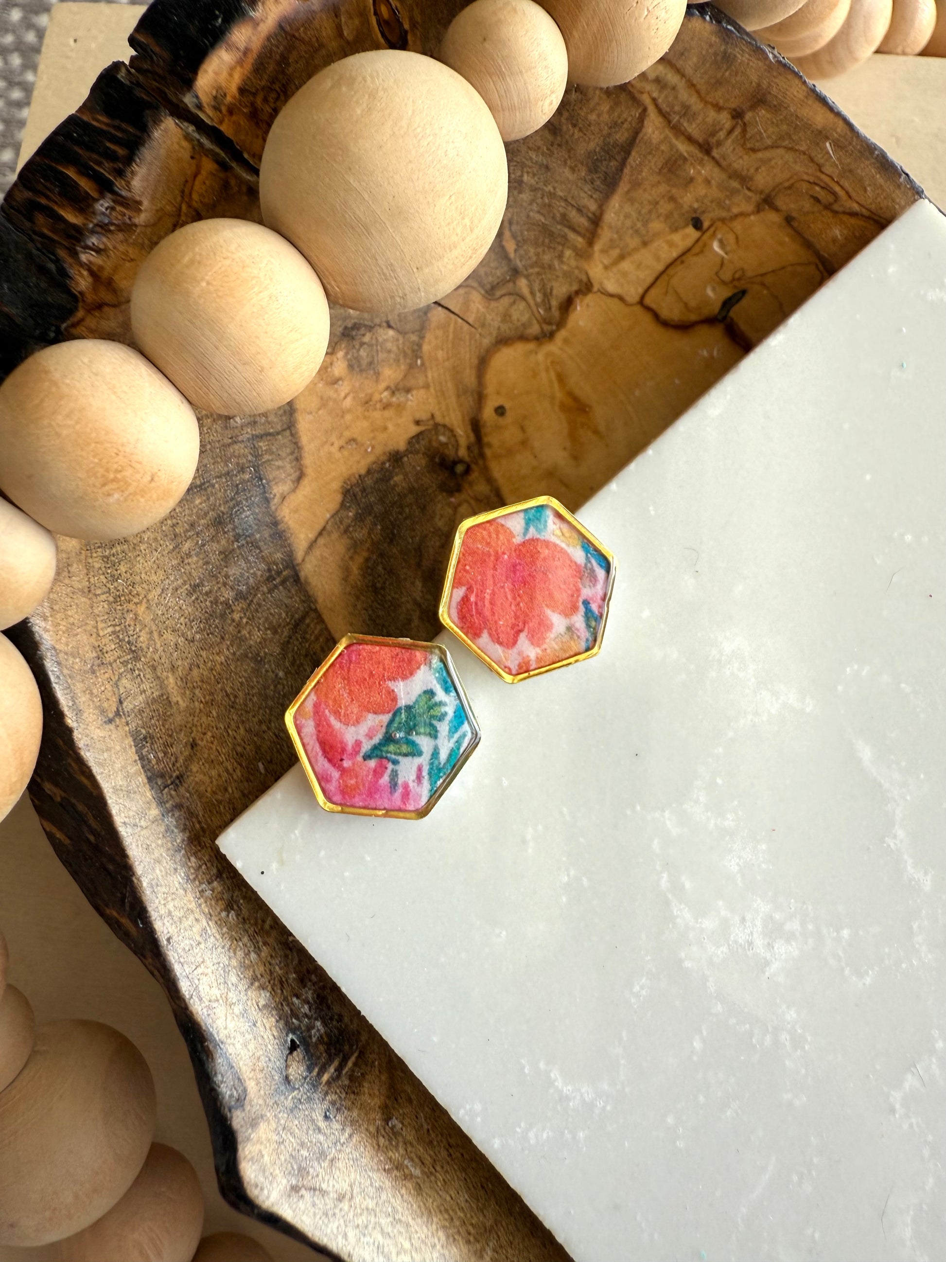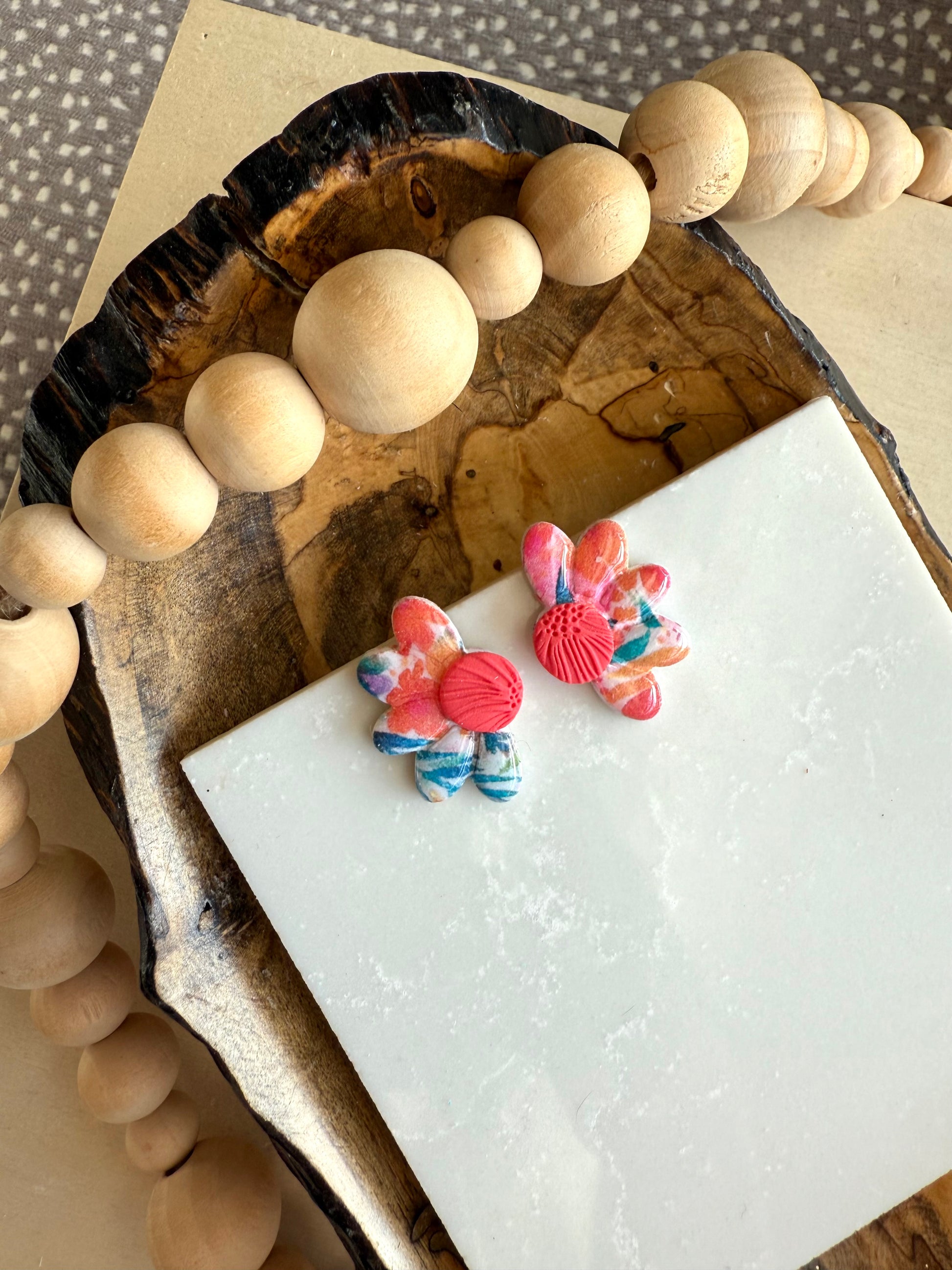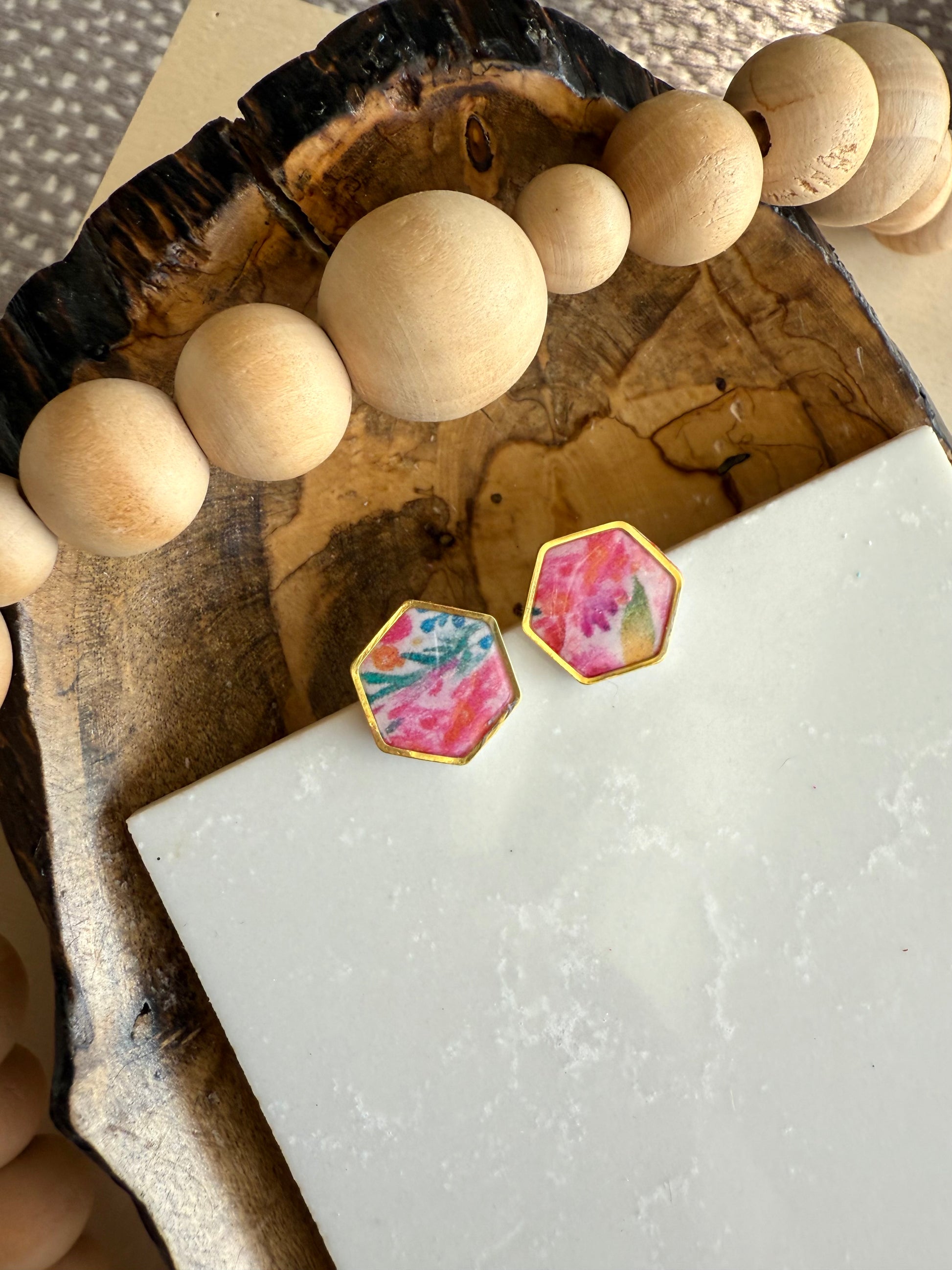 White clay base with summery floral transfer design. Gold plated studs.